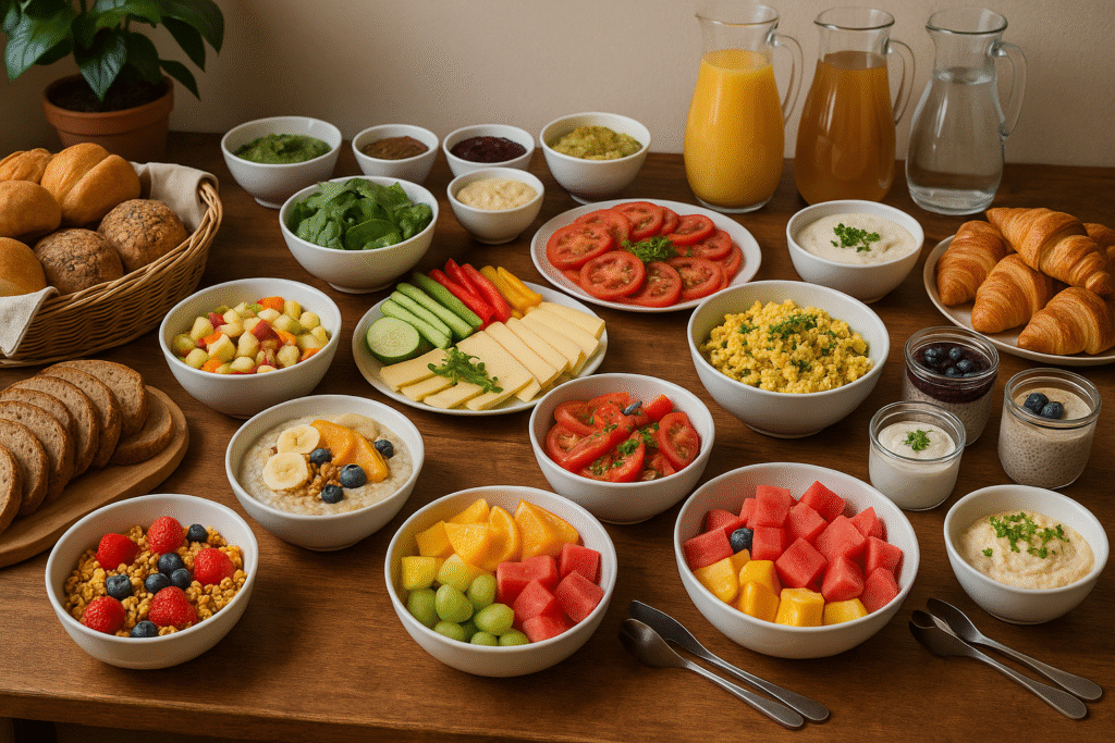 Reichhaltig, vegetarisch-vegan und mit frischen Bio-Zutaten, unser Buffet für einen genussvollen Morgen.
